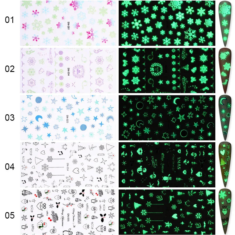 CHS021 Luminous Nail Art Sticker Christmas Snowflake Patterns 3D Nail Decoration Decals Transfer Glow in Dark 1 Sheet